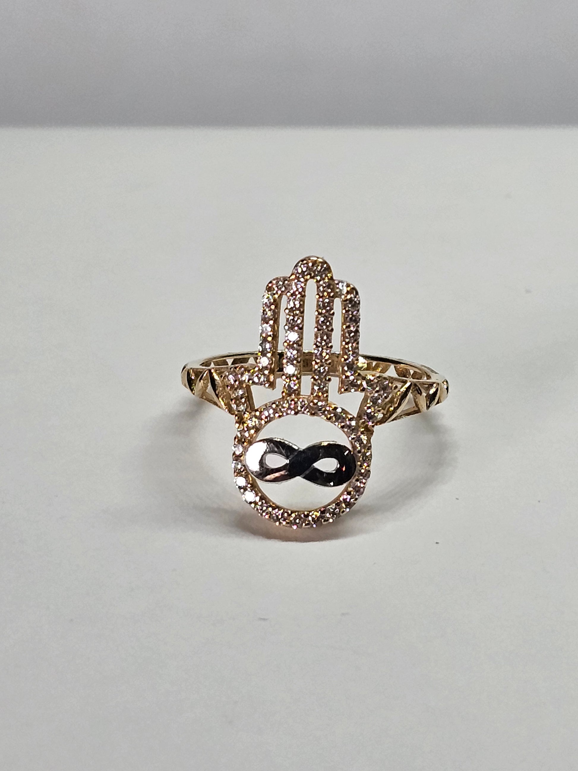 Crafted with a delicate 14k gold, this Anillo manita de fatima showcases a timeless symbol of protection and blessings. The intricate design of the Fatima hand and infinity symbol adds a touch of elegance and meaning to any outfit. A perfect gift for loved ones.