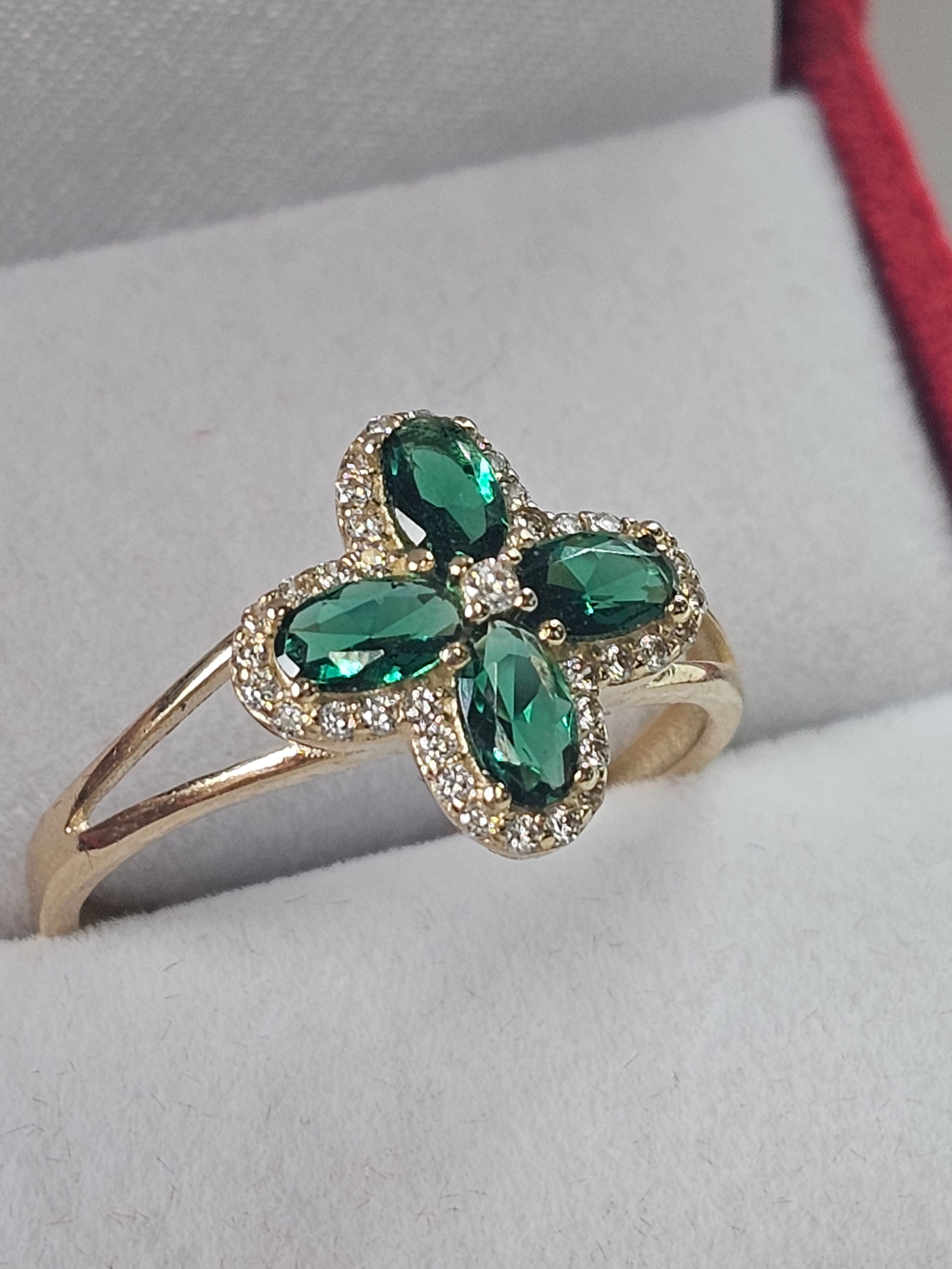 The lovely ring is crafted from 14-karat gold, ensuring durability and a timeless aesthetic. Featuring green stones, this ring offers a striking visual contrast, suitable for both everyday wear and special occasions. Its size #8 guarantees a comfortable fit for a variety of users.