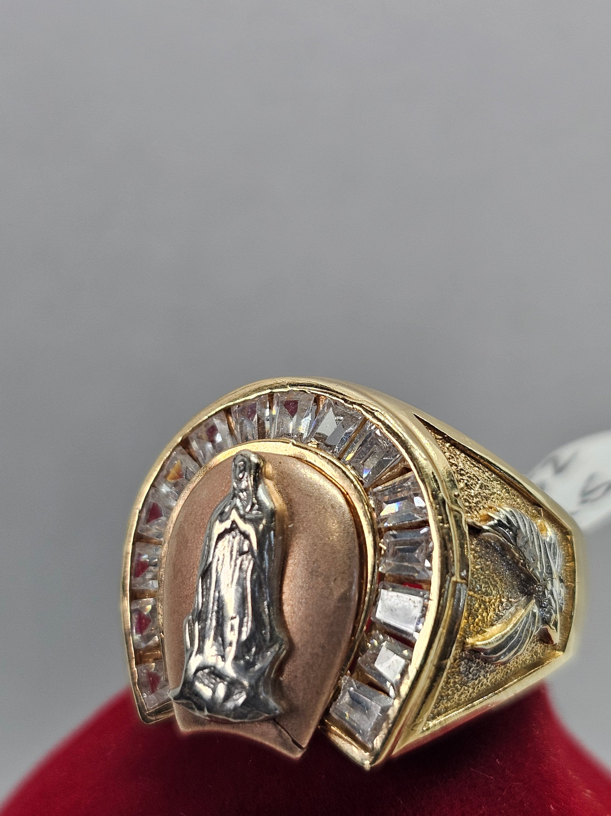 This 14k gold men's ring features a detailed engraving of the iconic Virgin of Guadalupe. A symbol of faith and protection, this ring is perfect for any man seeking both style and spiritual significance. Crafted with high-quality materials, it is a timeless piece that will make a statement for years to come.