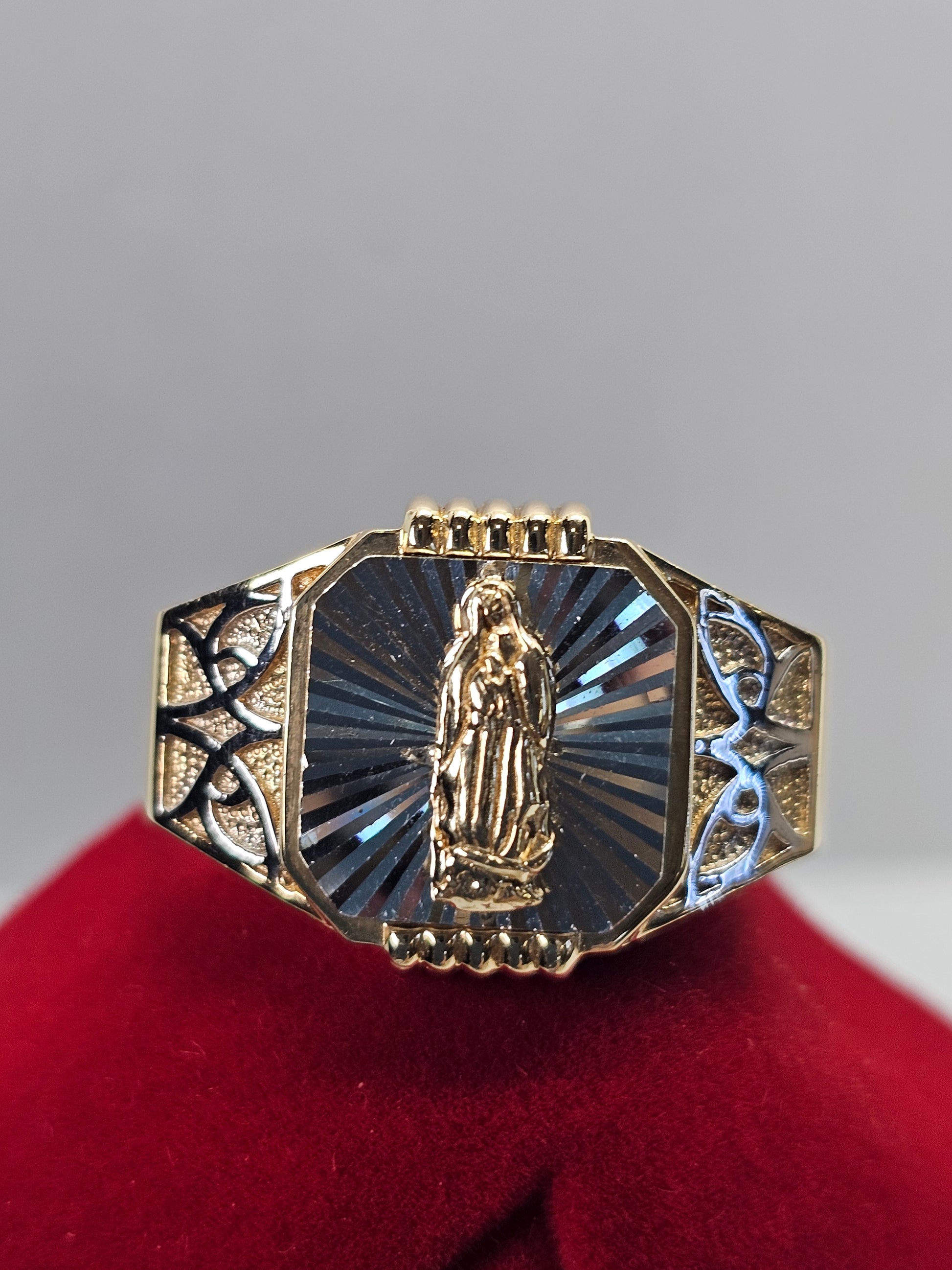 This 14k gold men's ring features a detailed engraving of the iconic Virgin of Guadalupe. A symbol of faith and protection, this ring is perfect for any man seeking both style and spiritual significance. Crafted with high-quality materials, it is a timeless piece that will make a statement for years to come.