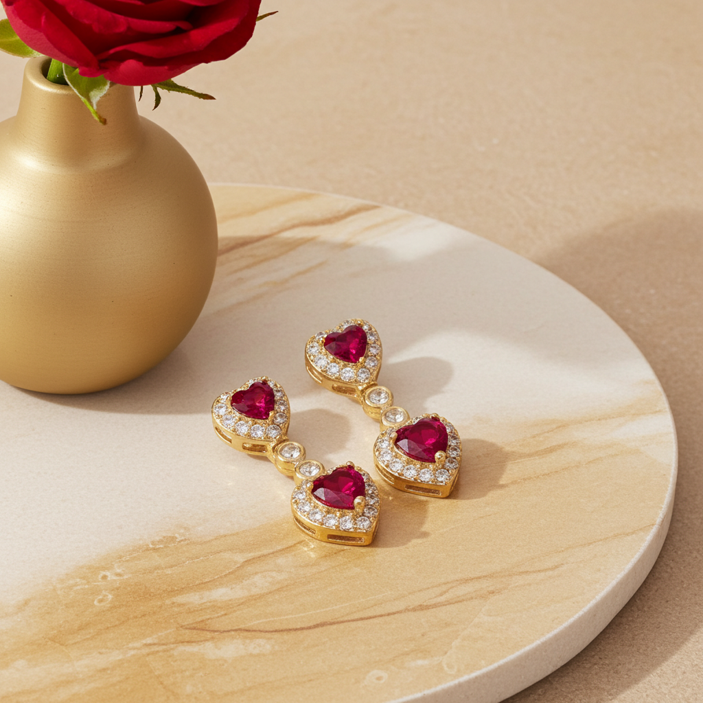 Double Heart Dangling Drop Push Back Stud Earring Red CZ Yellow Gold 14k